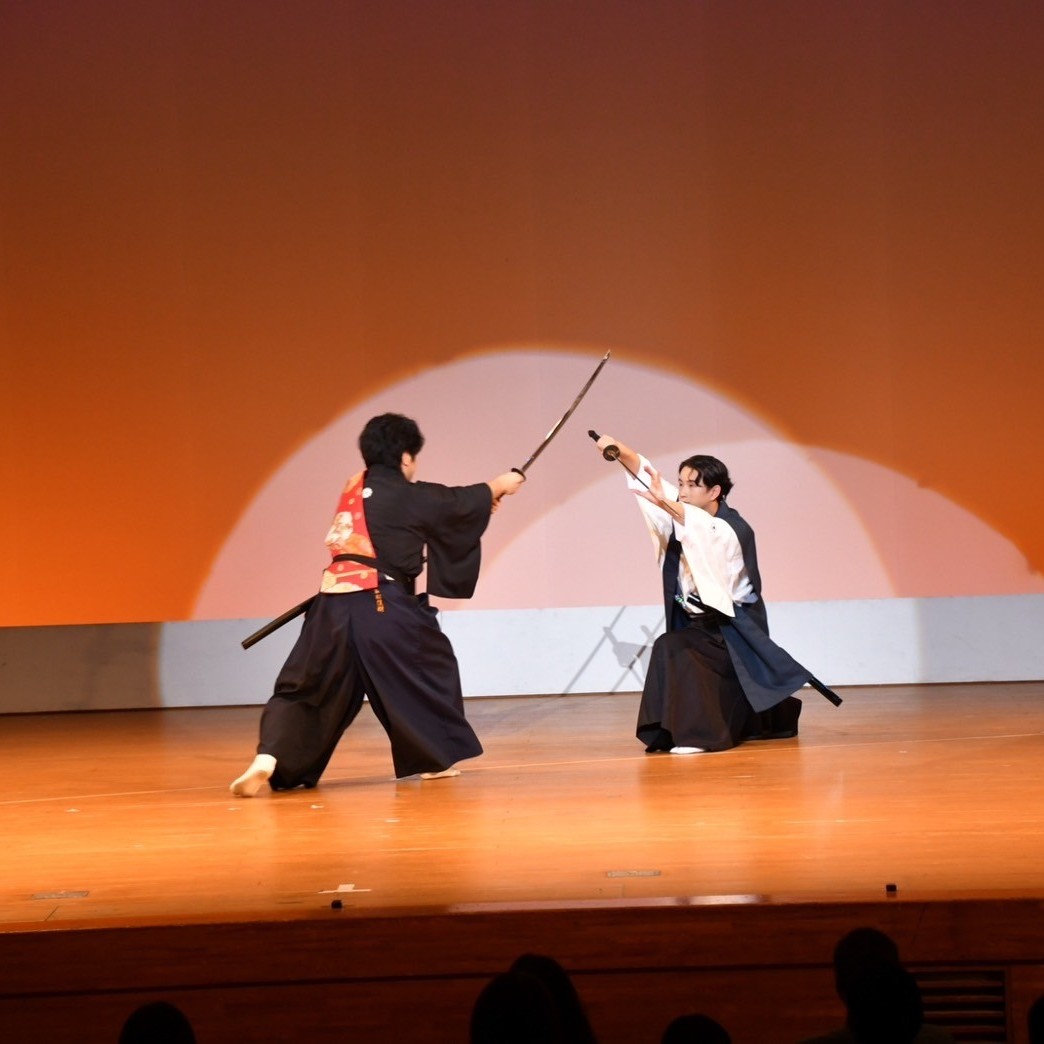 剣舞道は剣や扇を使い曲に合わせて舞う伝統芸能です。月・土曜に教室や公民館にて、講師の先生の指導のもと九大祭や外部舞台にむけて練習しています!