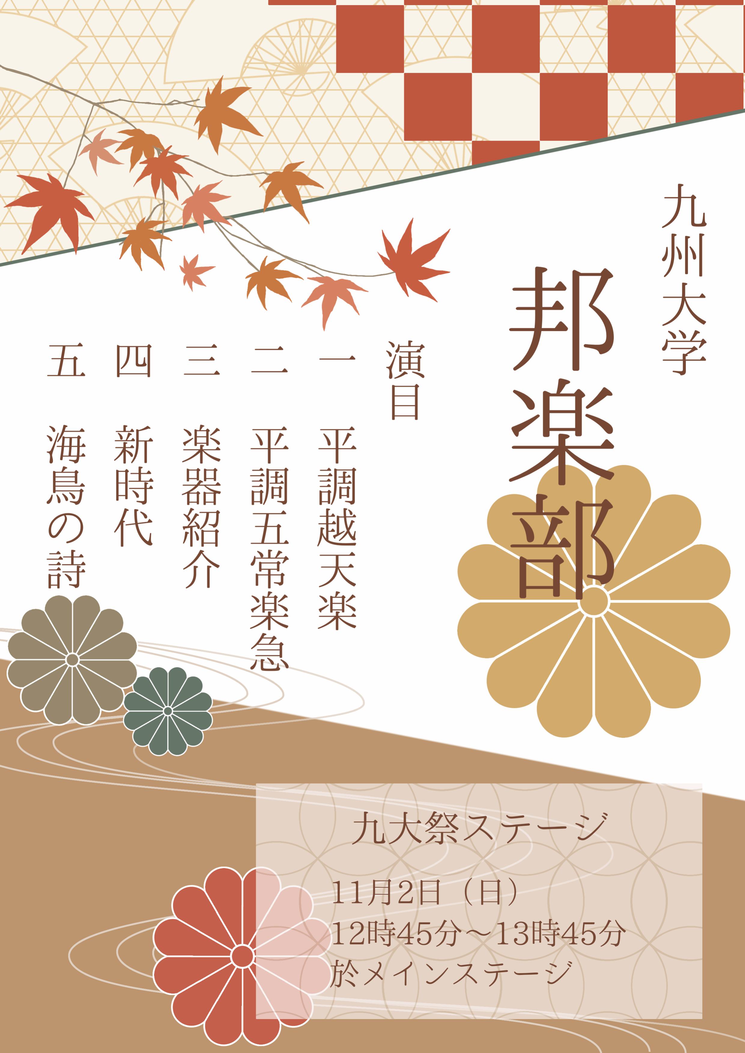 九州大学邦楽部です。邦楽班(箏・三味線・尺八)と雅楽班(龍笛・篳篥・笙)が演奏を行います。和の音楽を楽しんでください◎